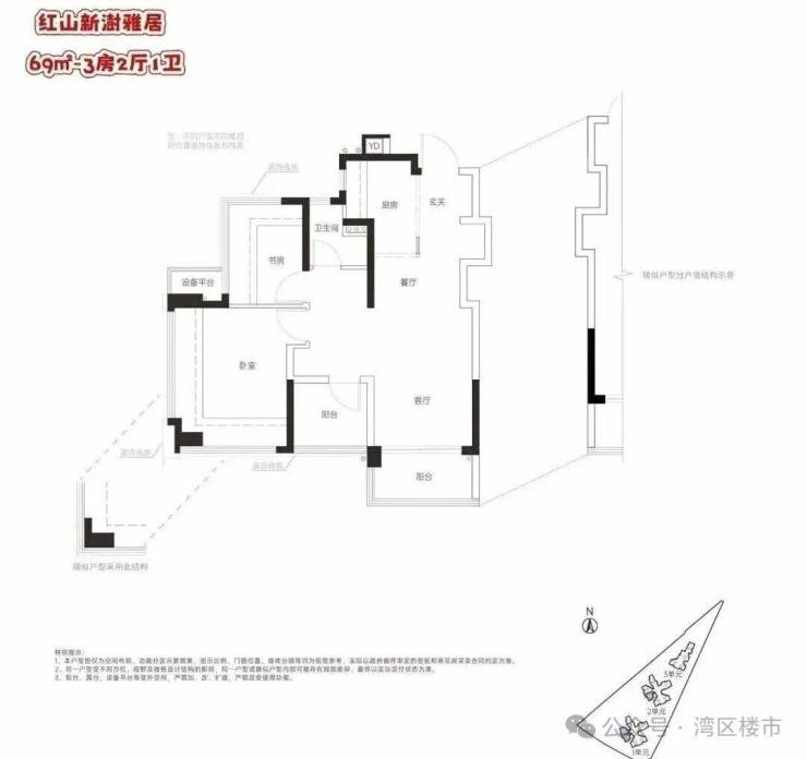 龙华红山,联发新澍雅居预计2026年一季度取证入市,户型相当炸裂,面积有69平的2+1房1卫,79-82平的3房2卫,99平的4房2卫户型,共332套房源,价格方面可以参考附近前期入市的联发臻著雅居,备案均价7.3万/㎡,当时折后均价约6.4万/平,期房精装交付,目前营销中心暂未开放,户型图供参考