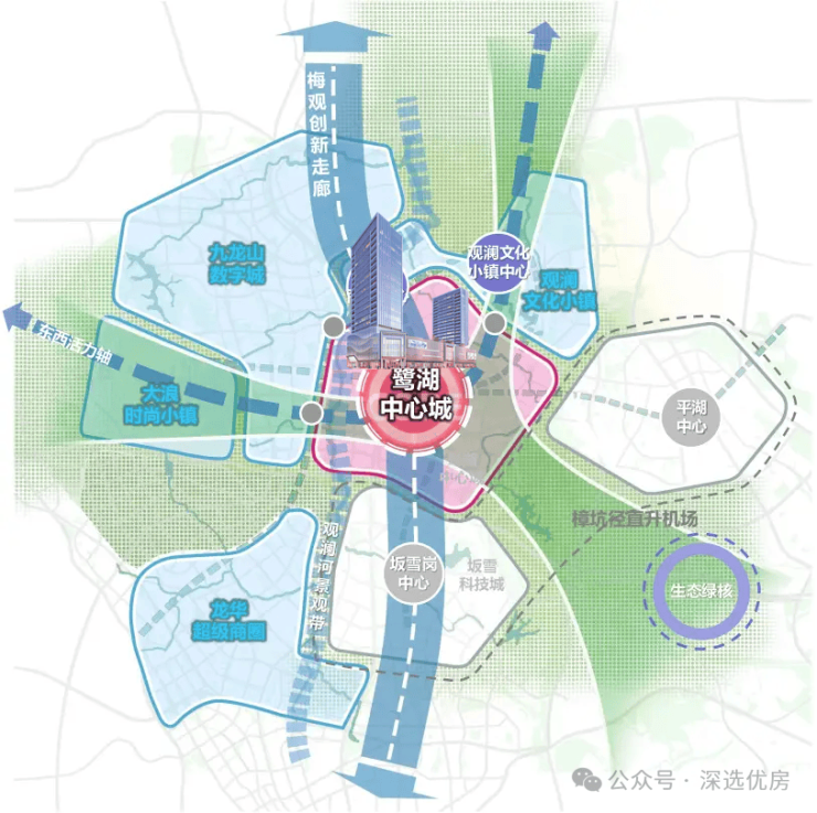 龙华产核——鹭湖中心城地处龙华万亿级数字经济圈、梅观创新走廊的交汇中心,亦是龙华六大重点片区的核心枢纽