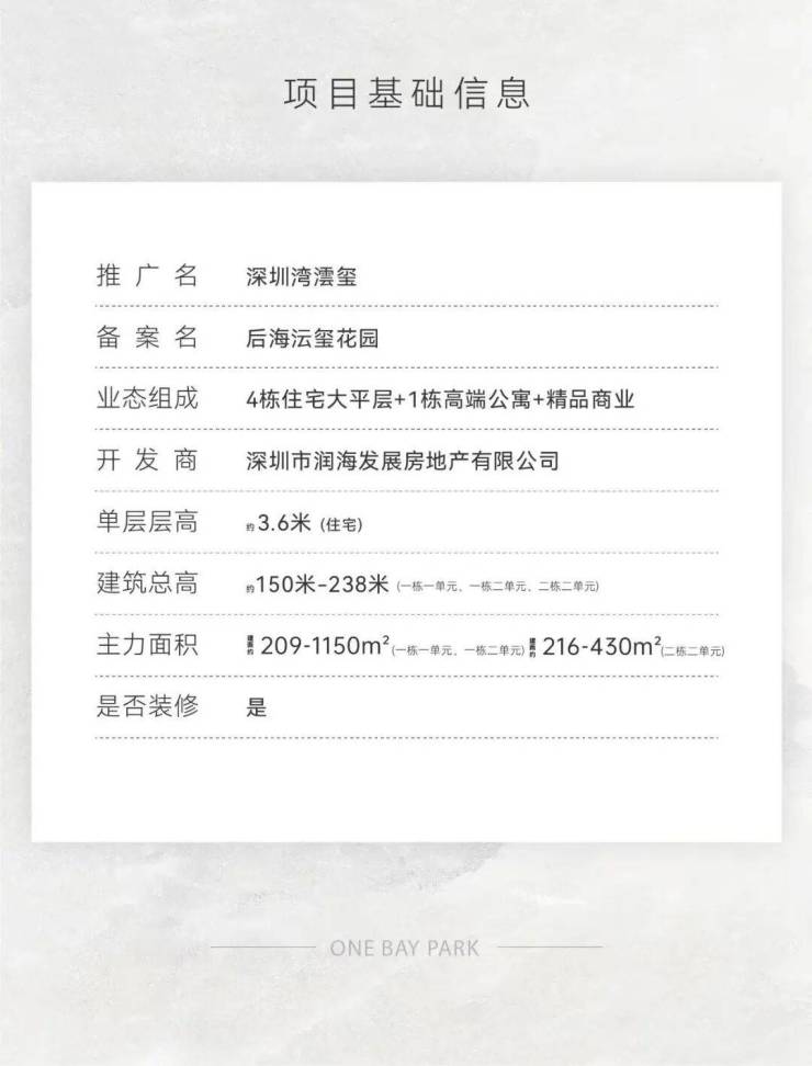 免责声明:本资料对项目周围环境、交通、商业、文化教育、医疗设施及其他市政设施的介绍,仅为提供相关信息,不意味着本公司对此做出任何承诺,所有内容均以政府最终审批文件和买卖双方签署的买卖合同为准。本资料基于2026年1月前所获取项目规划方案制作,图片为示意图非实景图,仅做示意参考,并不视为商品买卖合同的内容或交付标准和条件,后期可能存在变化。我司保留对图片/视频修改的权利,敬请留意最新资料。项目推广名为【深圳湾澐玺】,备案名为【后海沄玺花园】,预售证号:深房许字(2025)南山009号,本资料发布时间为2026年2月, 开发商名称:深圳市润海发展房地产有限公司。