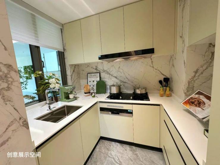 整个半开放式厨房简约明亮,兼顾了开放共享与社交的生活需求,大操作台面为家人提供共同烹饪之乐,预留宽敞的冰箱、烤箱位等,并配备隐藏式收纳。