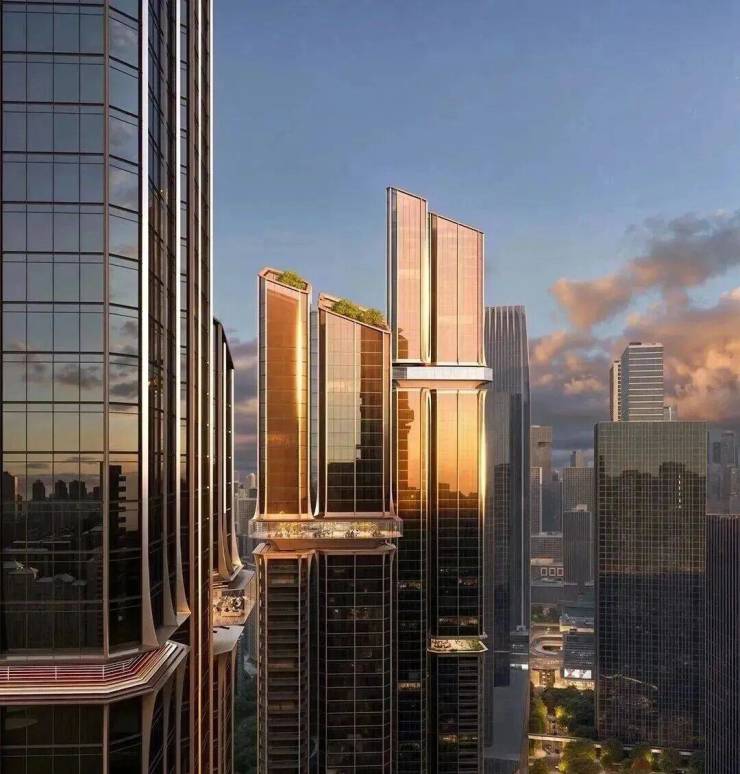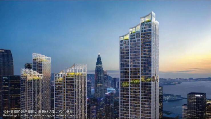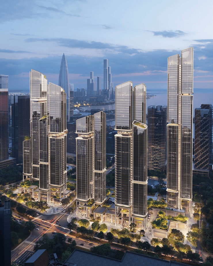 塔楼规划:由5座150-250米塔楼组成(1座250米公寓,4座住宅分别为150米、200米、200米、240米),采用错落布局和平面退台设计,优化深圳湾景观视野,层高3.6米,约40-70层(不含底商)。外立面采用全玻璃幕墙,设计灵感来自植物细胞的有机形态,原方案锐利阳刚,新方案柔软温润,类似天鹅湖花园和红树西岸,强调自然与居住融合,绿植丰富。
