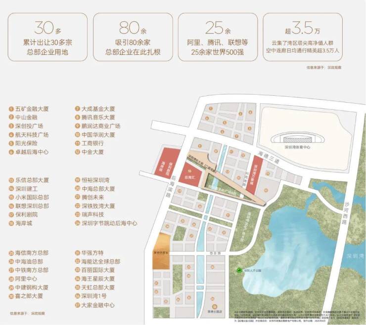 深圳湾沄玺被普遍视为“后海总部基地最后一块含宅地王”,位于南山区粤海街道,东侧直面深圳人才公园、深圳湾海景,周边汇聚阿里、腾讯、中海油、字节跳动等80多家世界500强华南总部,产业能级与城市封面价值显著。这个区域是深圳湾核心成熟区,配套(如深圳湾体育中心、万象城、春笋)与产业资源远超深圳湾超级总部基地(深超总),稀缺性是其最大卖点。