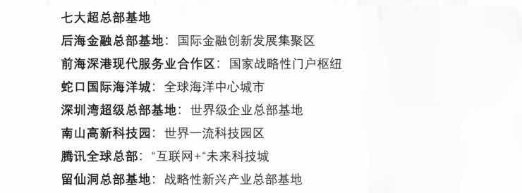 七大全球总部基地,激荡全球资本的湾区超核,由总部经济带串联,吸引大批诸如腾讯、大疆、阿里巴巴等行业龙头企业,以及大批总部企业入驻,未来将吸引260万人才聚集。