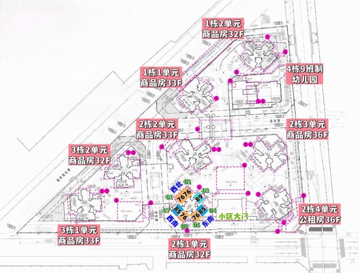 天健瑞云府,由天健集团+深福保+深高新集团3家国企联合打造,总占地面积约3.6万㎡,总建筑面积约22.49万㎡,计容建筑面积约16.46万㎡,容积率4.75,绿化率30%,共由8栋32-36层高住宅组成,分3个地块开发,不过花园都是共享连通在一起的,其中1栋1单元/2栋2单元/3栋1单元住宅33F,1栋2单元/2栋1单元/3栋2单元住宅32F,2栋3单元/2栋4单元住宅36层,4栋是1所9班制幼儿园。