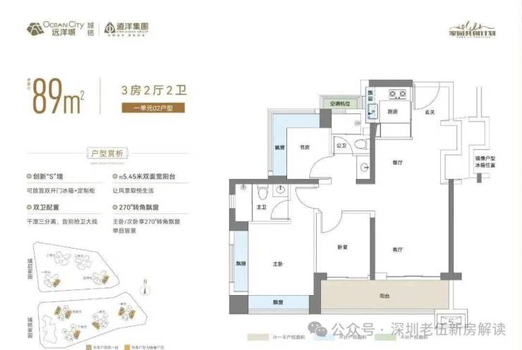 89㎡的3房2厅2卫,02.03户型,设计的是经典竖厅格局,客厅3.4米开间,LDKB一体化,S墙设计预留冰箱卡槽位,动静分区,三开间朝南,3个卧室分别做到了主卧13.79㎡/次卧7.62㎡/次卧6.93㎡(包含墙体飘窗),主卧+1个次卧270°飘窗设计,U型厨房,公卫三段式分离,客厅连接卧室出5.75米长的大阳台,得房率约87.2%(包含赠送),东南朝向。