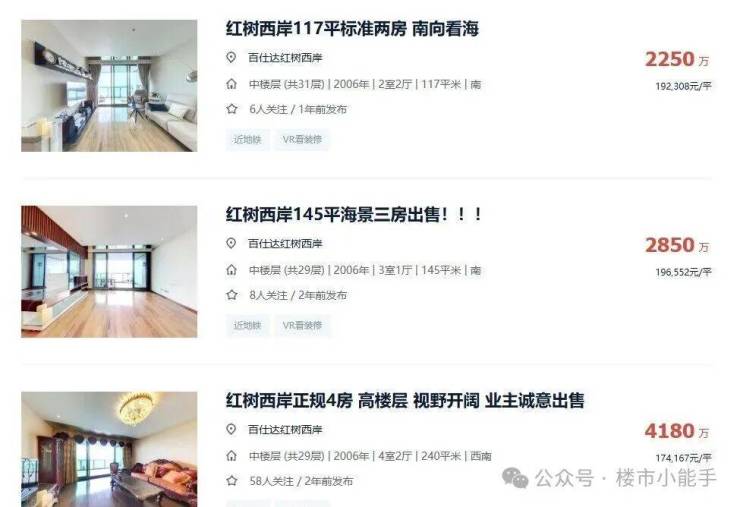深圳湾超级总部板块,楼龄接近20年、临滨海大道的百仕达红树西岸,均价约17.6万/㎡;中信红树湾南北区,大致在14.1万/㎡左右。