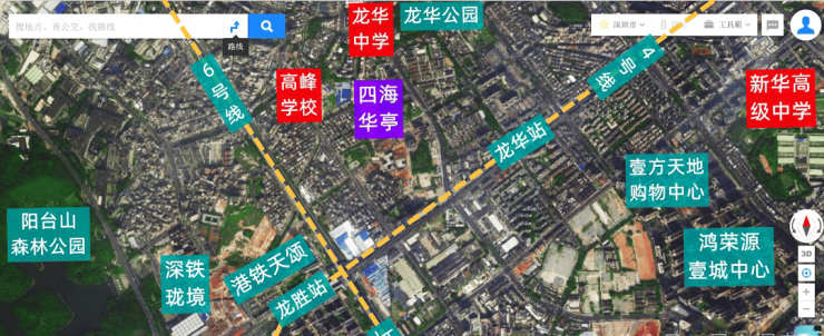 四海华亭,位于龙华区大浪街道龙胜路与春华路交汇处东侧,由华侨城集团开发,项目毗邻高峰学校,周边多为城中村,城市面貌稍差,不过基本都已经划入城市更新单元,东南侧约1.2公里是龙华最大的壹方天地购物中心,4号地铁线“龙华站”,“龙胜站”距离都在800米范围内,6号地铁线“上芬站”距离约1.4公里。