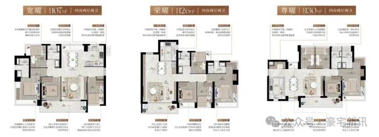 同等户型更舒适尺度:约93㎡宽幕三房约5.7米阳台直连客厅,舒适尺度媲美四房;约103-107㎡四房双跨宽景阳台,开阔尺度龙华稀缺。