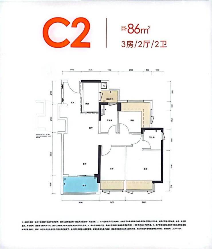89㎡的3房2厅2卫,设计的是横厅南北通透格局,进门入户玄关,客餐厅5.7米开间,LDKB一体化,四开间朝南,3个卧室分别做到了主卧11.42㎡/次卧7.31㎡/次卧6.93㎡(实测面积,去掉墙体),主卧还带1个设备平台,主卧连接客厅出5.5米长的超大阳台,U型厨房,卫生间三段式分离,赠送面积高达20.09㎡,实际得房率约104%(包含赠送),西南/东南朝向