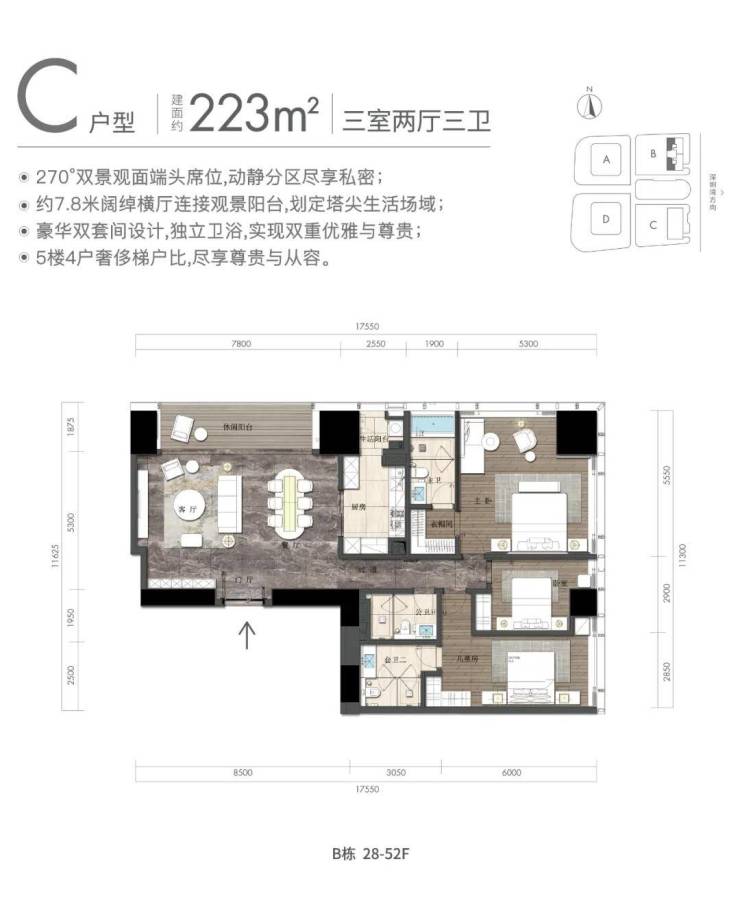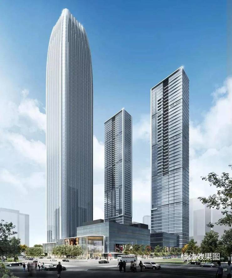 项目占地面积约2.5万㎡,总建面约41万㎡, 由三栋超高层建筑以及下沉式商业组成,其中写字楼高度约310m,公寓高度约255m,是集超甲级写字楼,顶级公寓,都会商业(约8万㎡)等业态于一体的超级综合体。