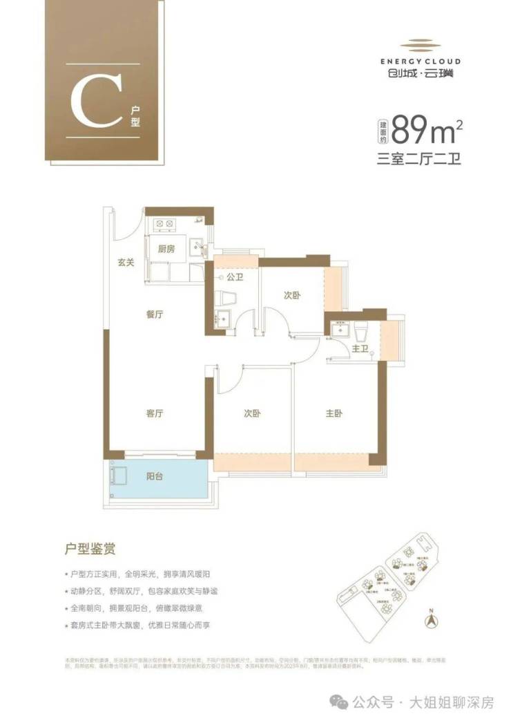 户型方正,动静分区明显,客厅外就是阳台,便于采光通风、观景。两个卧室及公卫均带飘窗,可做收纳,增加了使用空间