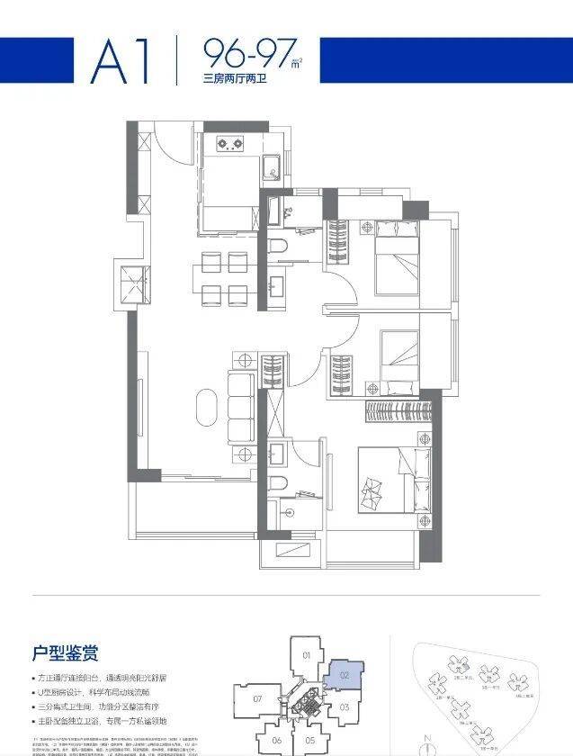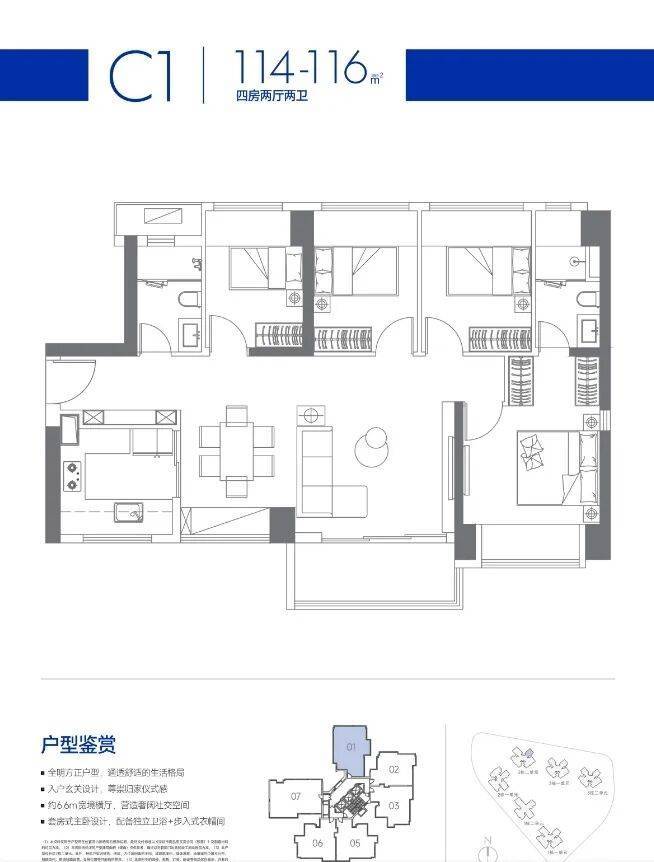 其中,住宅约17万㎡,包含6栋单元楼,共计约1508户。1栋2单元(46F)3梯5户,其余的1栋1单元(47F)、2栋1/2单元(47F)和3栋1/2单元(52-53F)均为3梯6户。同时在4栋规划了约1.2万㎡集中商业,另配建有一所18班幼儿园。