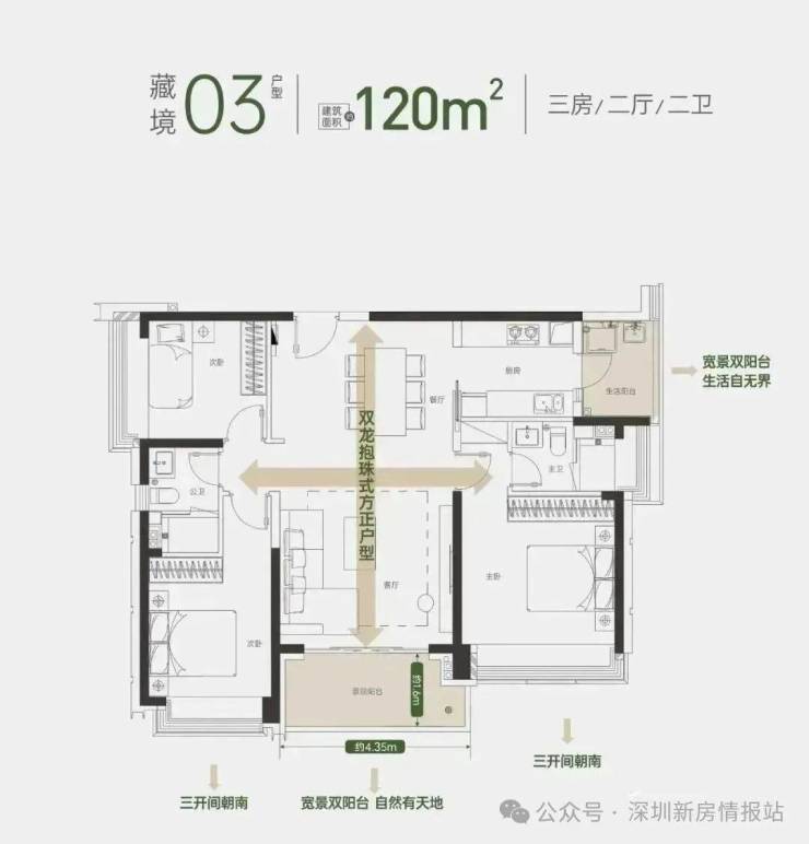 此次推售的1栋全是120㎡的三房两卫,两梯三户。