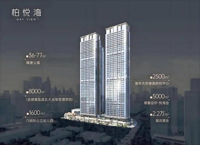 恒裕柏悦湾由2栋47层高公寓与2栋42层商办组成项目自带·约2.2万㎡潮流商业·约5000㎡精英会所·约8000㎡北大光华管理学院(北大光华瑞思楼)·约2500㎡清华大学港澳研究中心·约1600㎡六班制公立幼儿园共同组成约37万㎡垂直综合体——200米深湾超级地标