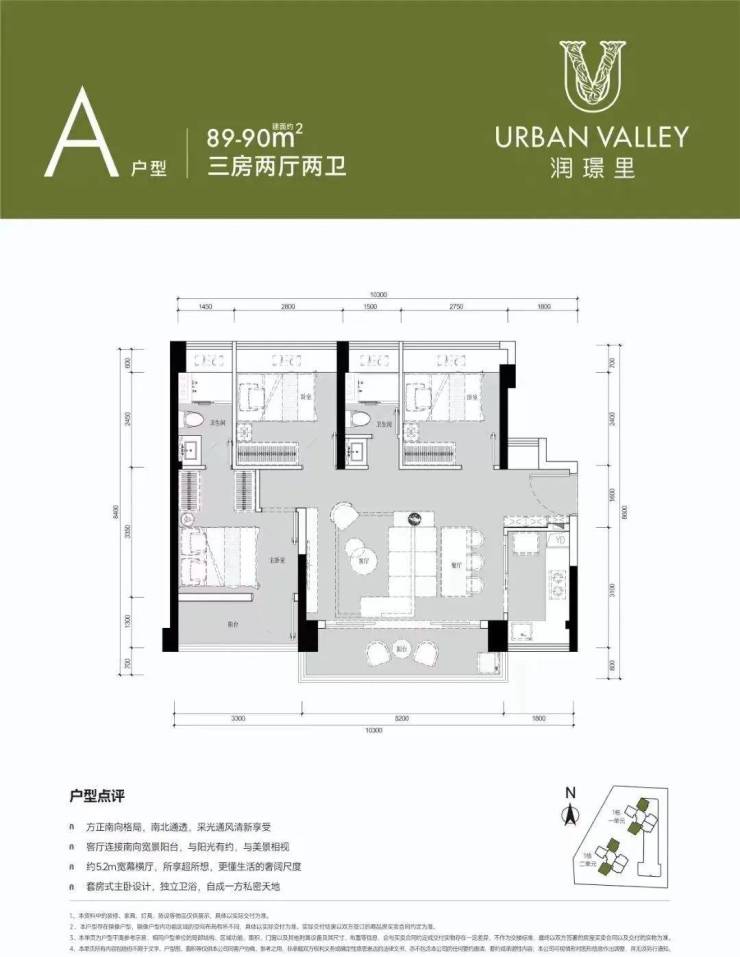 设计的是横厅南北通透格局,客餐厅5.2米开间,三开间朝南,3个卧室分别做到了3.3米/2.8米/2.75米的宽度,L型厨房,公卫三段式分离,阳台主朝东南向。
