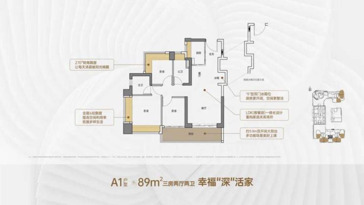 竖厅格局,客厅3.5米开间,LDKB一体化,S墙设计预留冰箱卡槽位,客厅连接次卧出5.9米长的大阳台,主卧双面飘窗,次卧270°转角飘窗,全屋6面飘窗,U型厨房,卫生间干湿分离。
