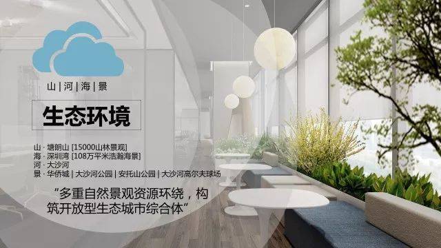 ■ 华侨城稀缺的城市山海资源尽显眼内;近60,000m²景观面积,绿化率超35%,生态融入办公、购物、休闲的每一个细节。