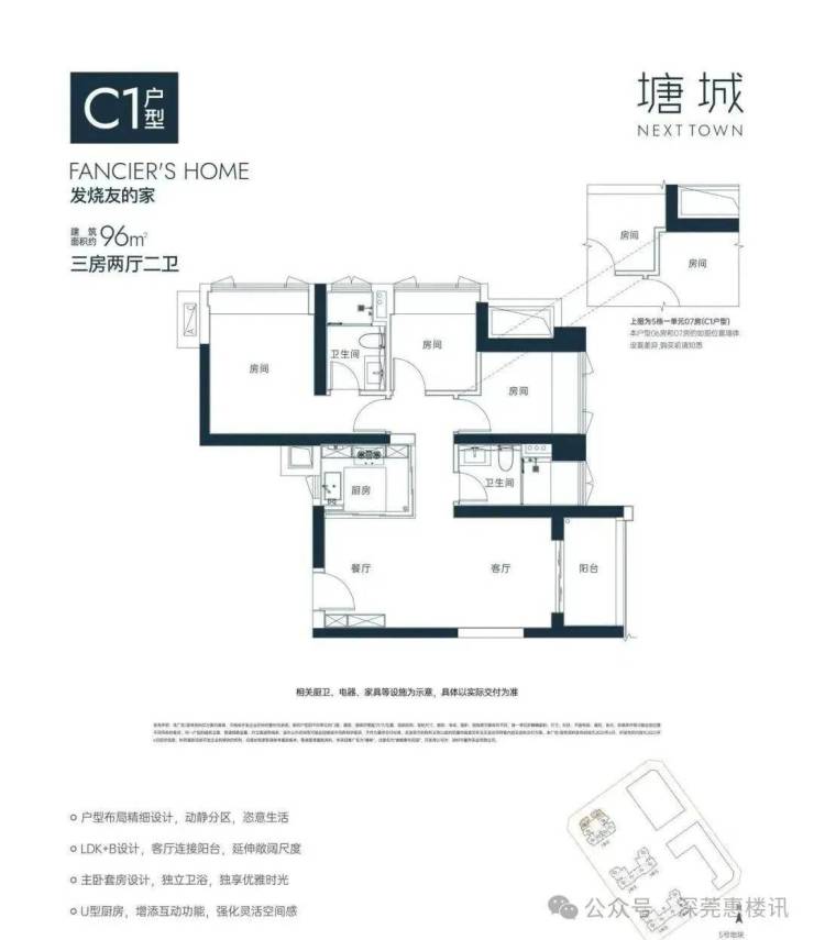 96㎡的3房2厅2卫,C1户型,5栋1单元06/07户型,设计的是竖厅格局,进门入户玄关,客厅3.3米开间,得房率约80%(包含赠送),东北或西南朝向。