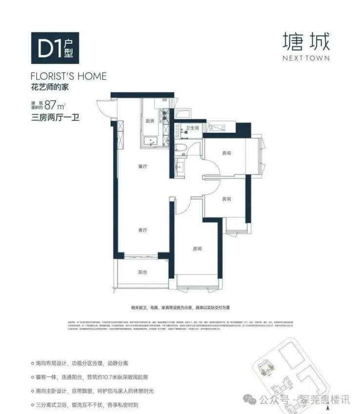 87㎡的3房2厅1卫,D1户型,5栋1单元01/04户型,设计的是竖厅格局,进门入户玄关,客厅3.3米开间,约10.7米纵深,三开间朝南,得房率约80%(包含赠送),东南朝向。