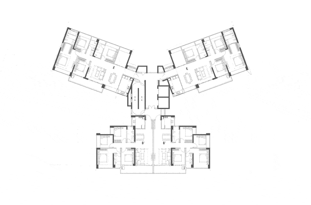 每个楼型根据不同的产品面积与景观资源分布,塔楼根据不同的总图条件选型,核心筒与户型的关系进行了不同的组合对比研究,力求找到最匹配景观资源的产品分布组合。