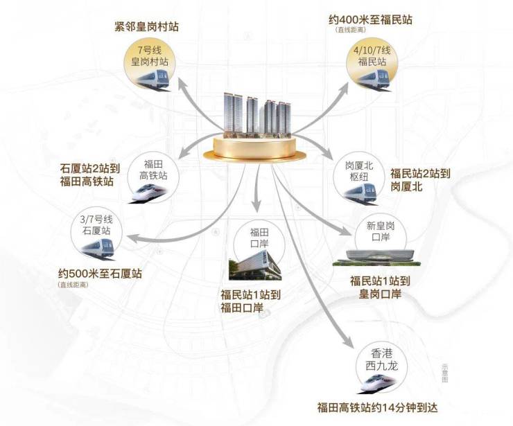 ·1站双口岸 ·2站福田高铁站 ·2站岗厦北枢纽 ·双地铁口 四地铁线