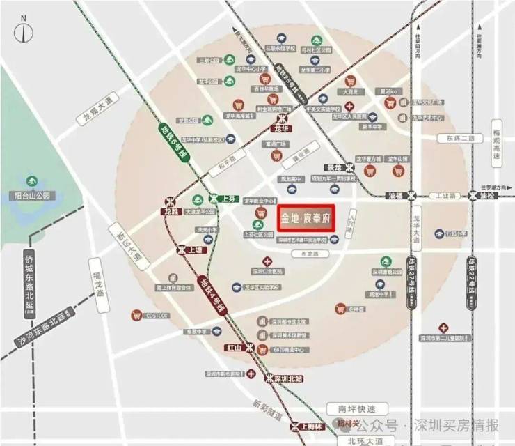 金地启曜府,位于深圳市龙华区民治街道工业路与人民路交汇处,处于龙华超级商圈核心区,已被纳入深圳都市核心区范围。这一区域在《深圳市国土空间总体规划(2021-2035年)》中获得"双中心"战略定位,即南部民治、龙华街道为都市核心区,北部规划为新一代城市中心,形成南北双轮驱动的发展格局。项目所在的龙华商业中心旧改总建面超200万㎡,涵盖住宅、商业、教育及交通配套,预计2028年全面建成后将形成集商业商务、文化时尚、休闲娱乐、高端居住于一体的深圳最具都市活力区域之一。
