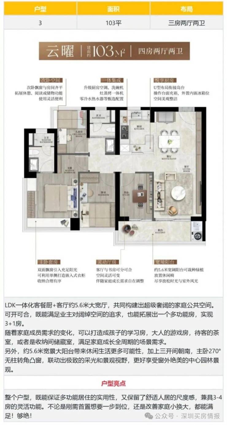 103㎡的4房2厅2卫,设计的是竖厅格局,LDKB一体化设计,动静分区,四开间朝南,主卧270°转角飘窗,U型厨房,公卫三段式干湿分离,得房率约90%(包含赠送),客厅连接餐厅出5.6米长的大阳台,西南或东南朝向。