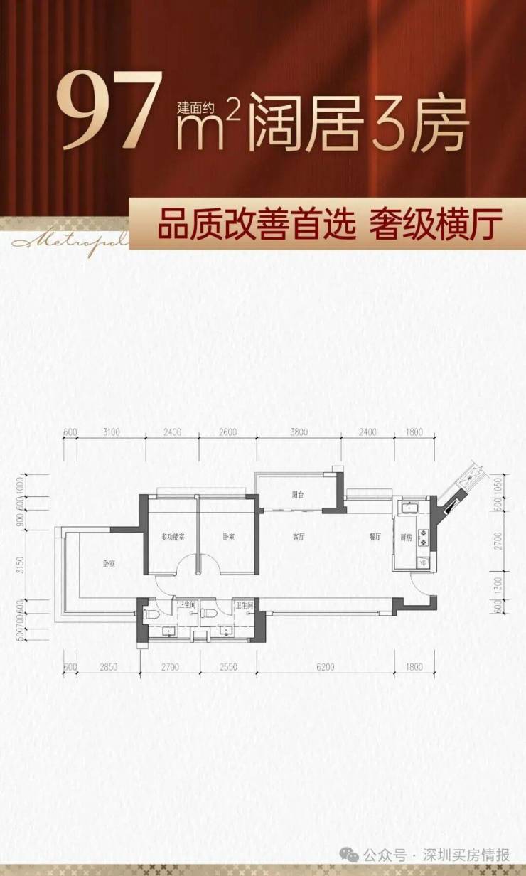 94㎡的3房2厅2卫,设计的是横厅南北通透格局,客餐厅6.3米开间,LDKB一体化,四开间朝南,卧室全南向,3个卧室分别做到了主卧15.3㎡/次卧8.5㎡/次卧8.16㎡(包含墙体飘窗),L型厨房,公卫三段式分离,得房率约77%(不含赠送),阳台主朝东北向。