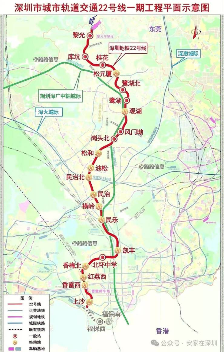 22号线鹭湖站在建,始于龙华黎光站,途经龙岗区,终于福田上沙站,开通后到福田仅需45分钟。