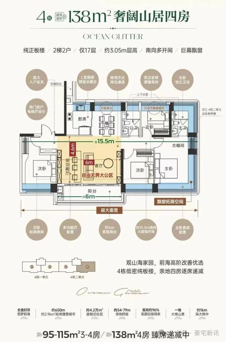 这次推出的138㎡为小区楼王3/4栋,17层2梯2户板楼,带独立电梯厅,可以做5房,赠送后得房率去到94-97%,预计单价10万/㎡左右,总价1300万左右。
