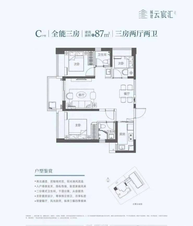 87㎡的3房2厅2卫,设计的双龙抱珠格局,餐客厅一体化,L型厨房,东南朝向。