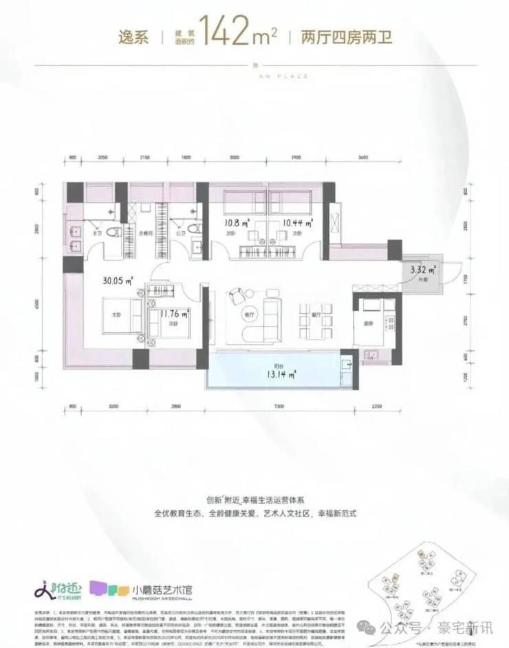 142㎡的4房2厅2卫,1栋2单元05户型/2栋1单元01户型,设计的是横厅南北通透格局,独门独户,赠送约3.32平的入户空间,客餐厅7.3米开间,LDKB一体化设计,五开间朝南,主卧带大衣帽间,分别做到了主卧30.05㎡/次卧11.76㎡/次卧10.8㎡/次卧10.44㎡(包含墙体飘窗),客厅连接餐厅出7.3米长的大阳台约13.14平,U型厨房,卫生间干湿分离,得房率约103.95%(包含赠送),西南或东南朝向。飘窗赠送面积24.12㎡+阳台赠送6.57㎡+外廊赠送3.32㎡=实际赠送34.01㎡。