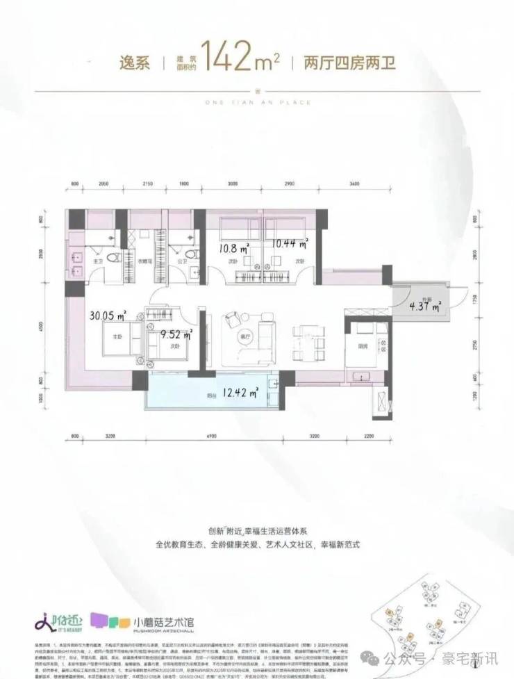 142㎡的4房2厅2卫,2栋1/2/3单元02户型,设计的是横厅南北通透格局,独门独户,赠送约4.37平的入户空间,客餐厅7.3米开间,LDKB一体化设计,五开间朝南,主卧带大衣帽间,分别做到了主卧30.05㎡/次卧10.8㎡/次卧10.44㎡/次卧9.52㎡(包含墙体飘窗),客厅连接次卧出6.9米长的大阳台约12.42平,U型厨房,卫生间干湿分离,得房率约104.2%(包含赠送),西南或东南朝向。飘窗赠送面积23.8㎡+阳台赠送6.21㎡+外廊赠送4.37㎡=实际赠送34.38㎡。