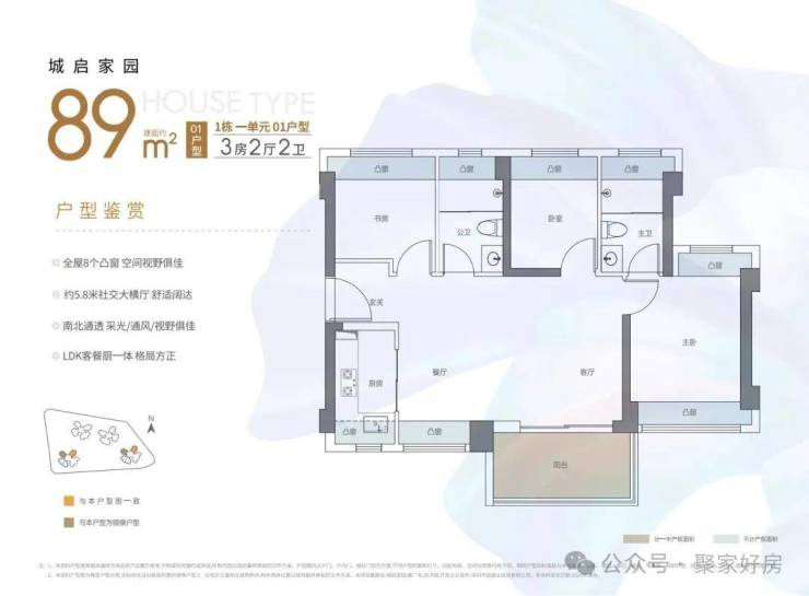 西南或东南向,户型是横厅南北通透格局,客餐厅5.8米开间,主卧双飘窗南北通设计,8个飘窗加阳台使用率在90%左右。