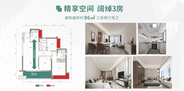 设计的是竖厅格局,客厅3.55米开间,LDKB一体化设计,3个卧室分别做到了3.75米/2.75米/2.4米的宽度,U型厨房,卫生间干湿分离,得房率:79.96%(不含赠送),阳台朝西南或东南向。