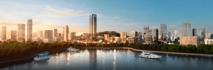 其以建筑美学诠释生活美学,作为 150 米人居地标,傲占山海盛境。历经国际设计团队 AECOM 七轮方案调整,确定为特色 L 型建筑,高 150 米屹立深圳湾,周边景观丰富,一湾繁华、山海盛境皆为业主窗前日常风光。