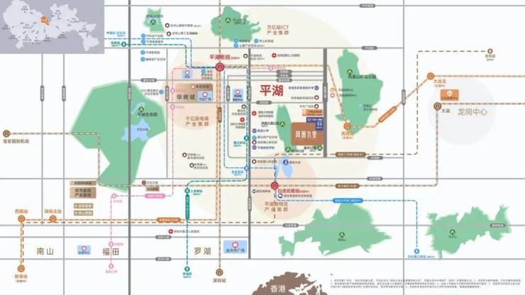 其中,平湖站为深圳九大枢纽之一,总投资约300亿,将与光明、福田等站共同构建“五主四辅”枢纽体系,建成集广深城际(在建中)、深惠城际(在建中)、深大城际(在建中)、地铁10号线(已开通)、地铁17(一期在建中)/18号线(规划中)等于一体的综合交通枢纽。其中距离项目最近的是五期规划的地铁17号线鹅公岭站约1公里
