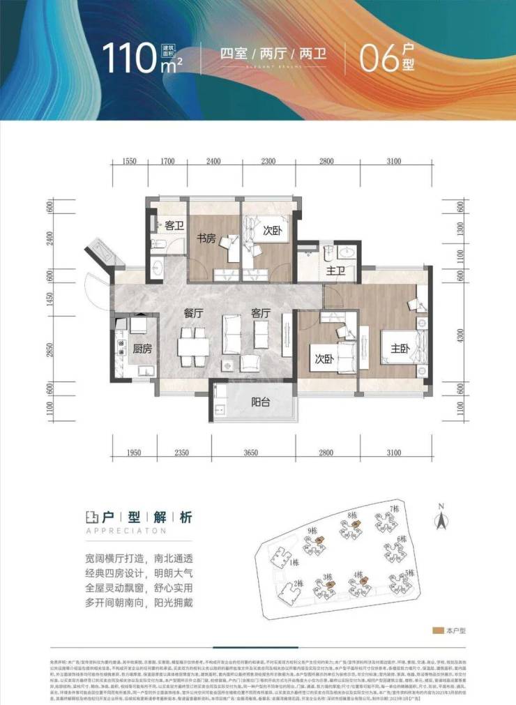 建面约110㎡ 4房2厅2卫:奢阔尺度横厅打造,阔绰景观阳台,动静分区合理,U型厨房操作使用,居住舒适度高