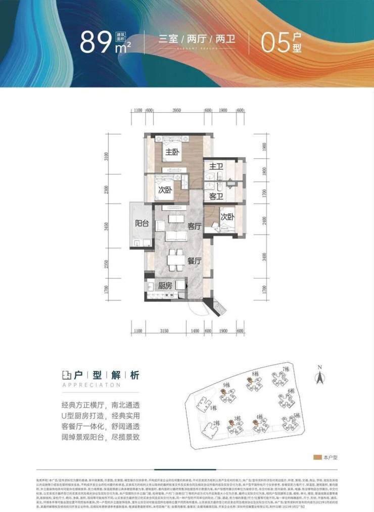 建面约89㎡ 3房2厅2卫(竖厅):南北通透3房,全凸窗设计,动静分区合理