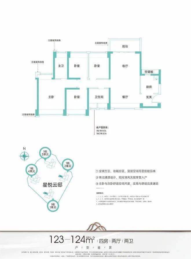 123-124㎡四房两厅两卫:竖厅南北通透格局,进门独立入户玄关,全屋飘窗设计,U型厨房。