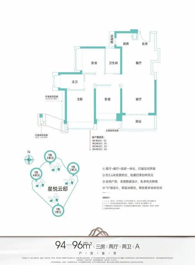 94-96㎡三房两厅两卫:经典竖厅格局,客厅3.6米开间,客餐厨一体化设计,三开间朝南,U型厨房。