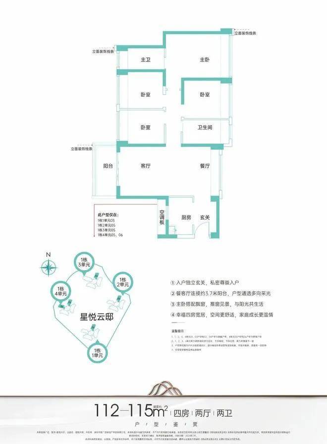 112-115㎡四房两厅两卫:竖厅通透格局,客厅3.7米开间,进门独立入户玄关,全屋飘窗设计。