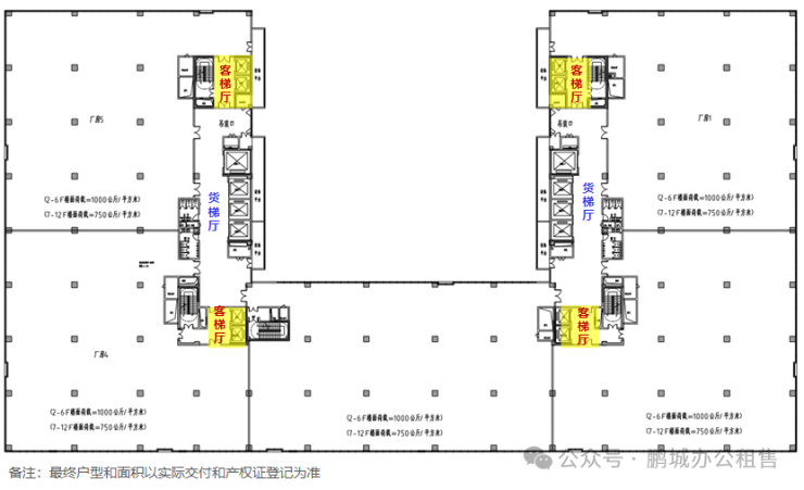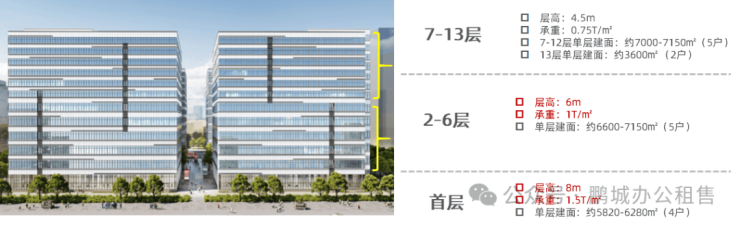 首层8米,2-6层6米,7-13层4.5米层高,满足各类企业生产空间需求