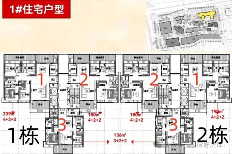 1栋:212㎡的4房、137㎡、185㎡、192㎡的3房
