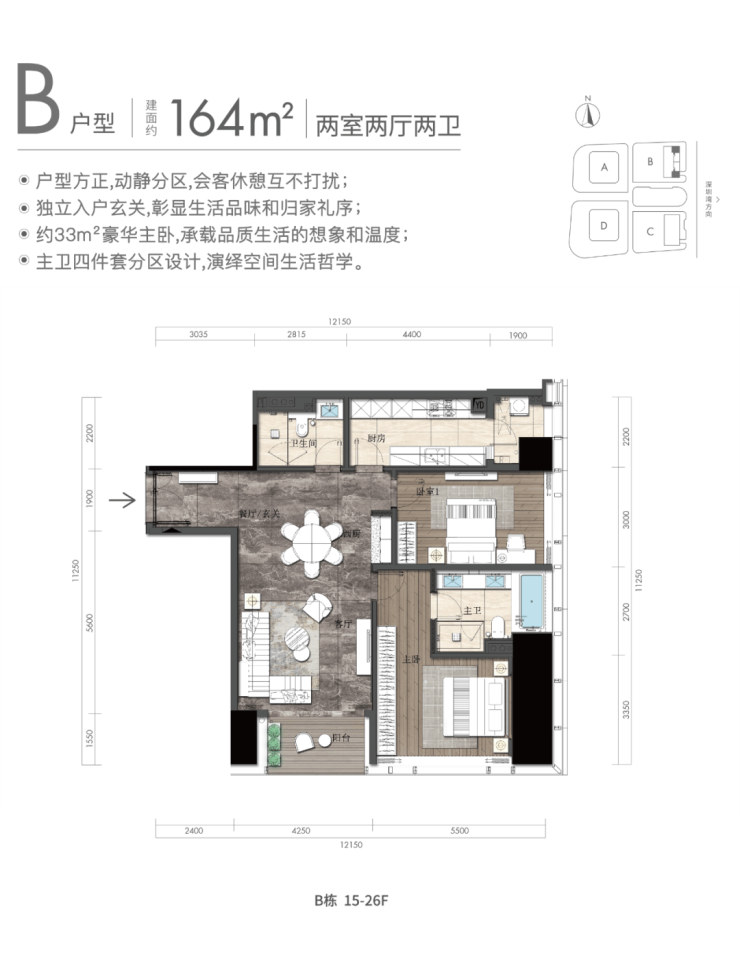 产品分段分布,162-164㎡户型分布在15-26层,223㎡以上户型分布在28-52层。