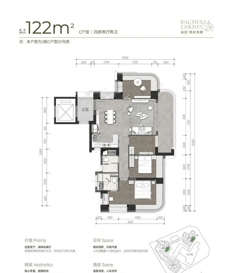户型:新规设计、高使用率,规划主力为3-4房产品。