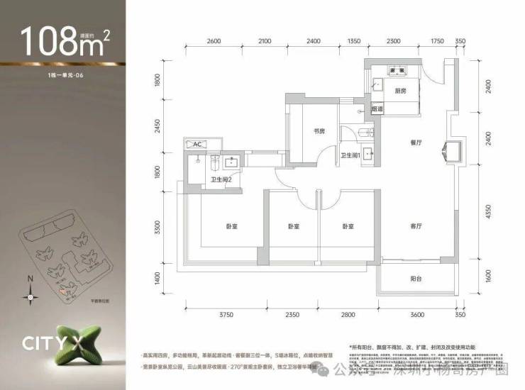 108㎡的4房2厅2卫,1栋2/3单元02/1栋1单元06户型,设计的是经典竖厅格局,进门入户玄关,客厅3.6米开间,LDKB一体化,S墙设计预留冰箱卡槽位,四开间朝南,动静分区,4个卧室分别做到了主卧16.2㎡/次卧9.24㎡/次卧7.76㎡/次卧7.32㎡(包含墙体飘窗),U型厨房,公卫三段式分离,得房率约90%(包含赠送),东南或西南朝向。