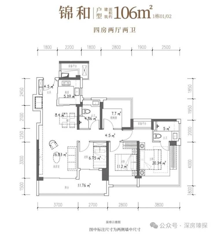 106㎡的4房2厅2卫,设计的是竖厅格局,客厅3.7米开间,LDKB一体化,S墙设计预留冰箱卡槽位,四开间朝南,动静分区,主卧270°无柱转角飘窗还带1个设备平台约1.52平,分别做到了主卧20.34㎡/次卧11.2㎡/次卧7.7㎡/次卧6.75㎡(包含墙体飘窗),U型厨房烟道外置,卫生间干湿分离,得房率约101.16%(包含赠送),客厅连接次卧出大阳台约11.76平,东南朝向。
