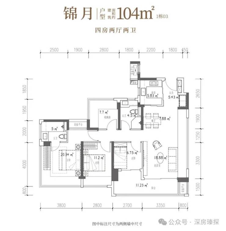 104㎡的4房2厅2卫,设计的是竖厅格局,客厅4.15米开间,LDKB一体化设计,预留冰箱卡槽位,四开间朝南,动静分区,主卧270°无柱转角飘窗还带1个设备平台约1.52平,分别做到了主卧20.34㎡/次卧11.2㎡/次卧7.7㎡/次卧6.75㎡(包含墙体飘窗),U型厨房烟道外置,卫生间干湿分离,得房率约100.71%(包含赠送),客厅连接次卧出大阳台约11.23平,西南朝向。