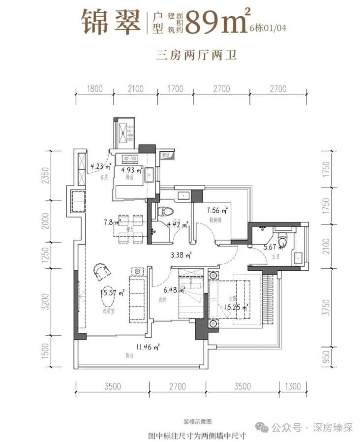89㎡的3房2厅2卫,6栋02/03户型,设计的是经典竖厅格局,客厅3.5米开间,LDKB一体化,S墙设计预留冰箱卡槽位,三开间朝南,动静分区,主卧+次卧270°无柱转角飘窗,分别做到了主卧15.25㎡/次卧7.56㎡/次卧6.48㎡(包含墙体飘窗),U型厨房烟道外置,卫生间干湿分离,得房率约97.47%(包含赠送),客厅连接次卧出大阳台约11.46平,西南或东南朝向。主要区别在于次卧跟主卫空间。